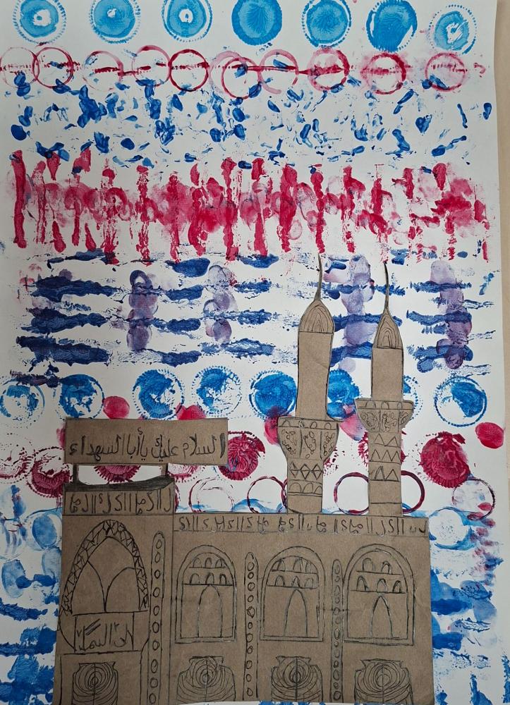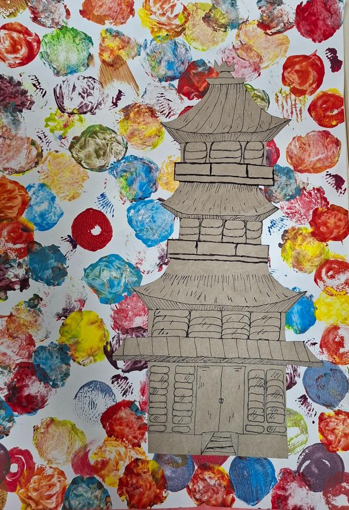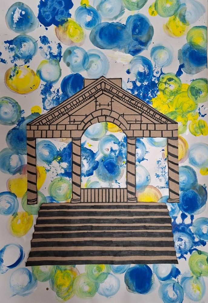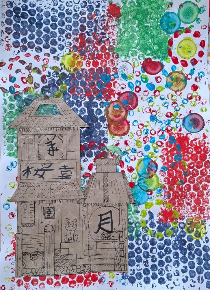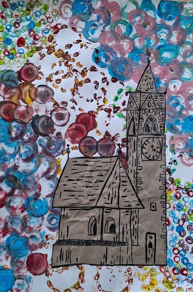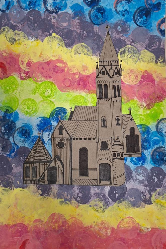 Gebäude auf Materialdruck von Mittelschule Ilse-Brüll-Gasse 07. Januar 2026 3b Galerie Ihren bunten Materialdruck verwendeten die Schüler*innen der 3b als Hintergrund für unterschiedlichste Gebäude.