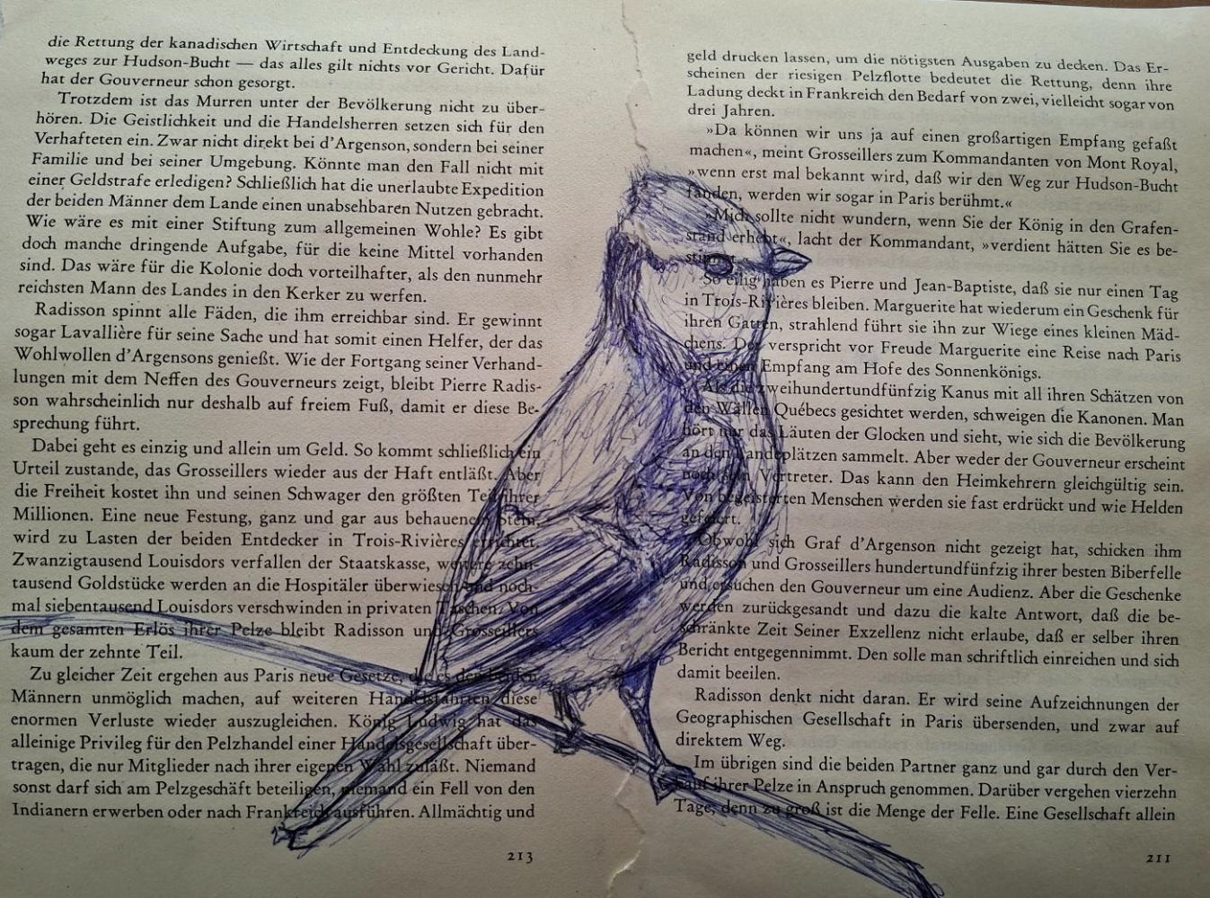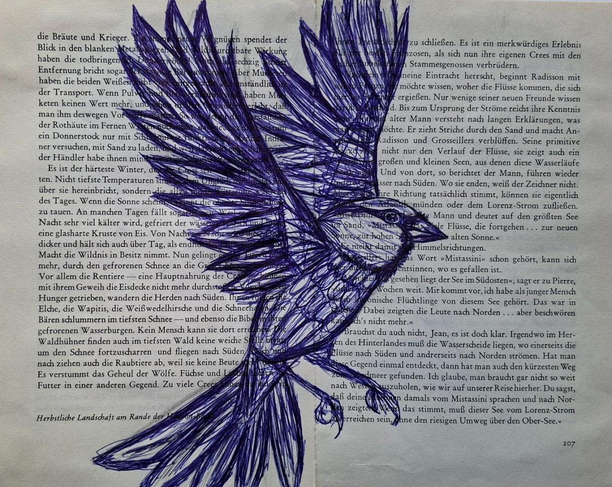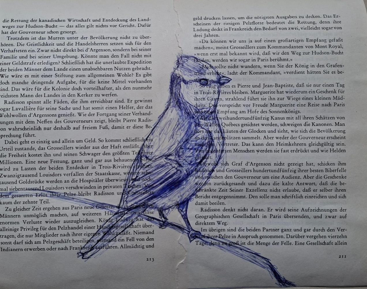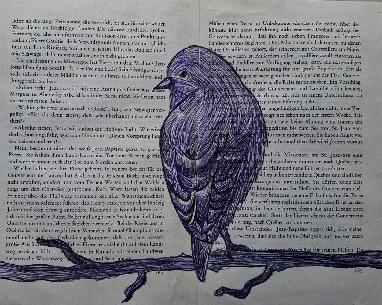 Heimische Vögel von Mittelschule Ilse-Brüll-Gasse 07. Januar 2026 4b Galerie Ihre Vögel zeichneten die Schüler*innen der 4b mit blauem Kugelschreiber. Als Hintergrund wurden Seiten aus einem alten Buch verwendet.