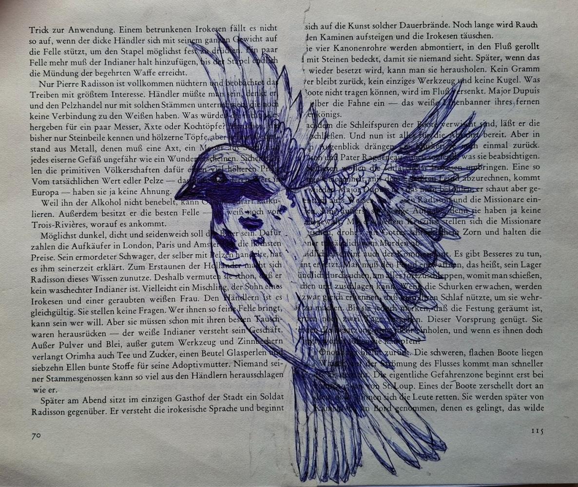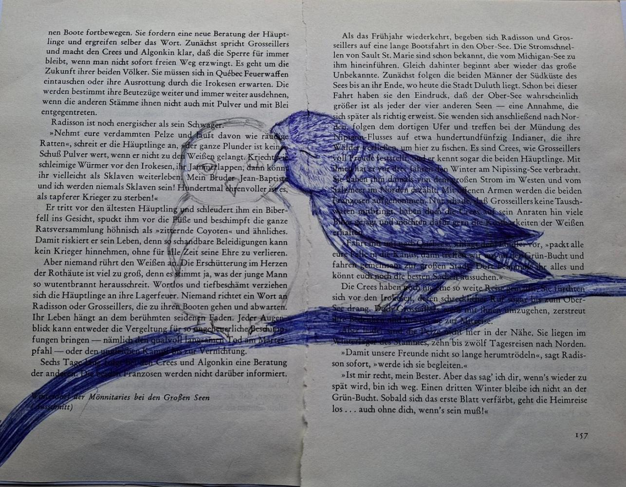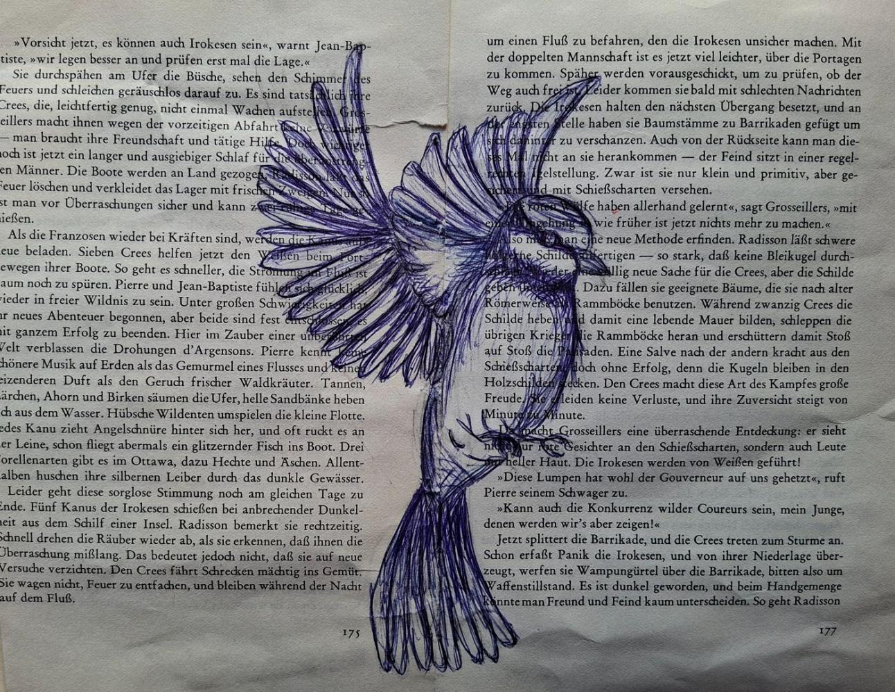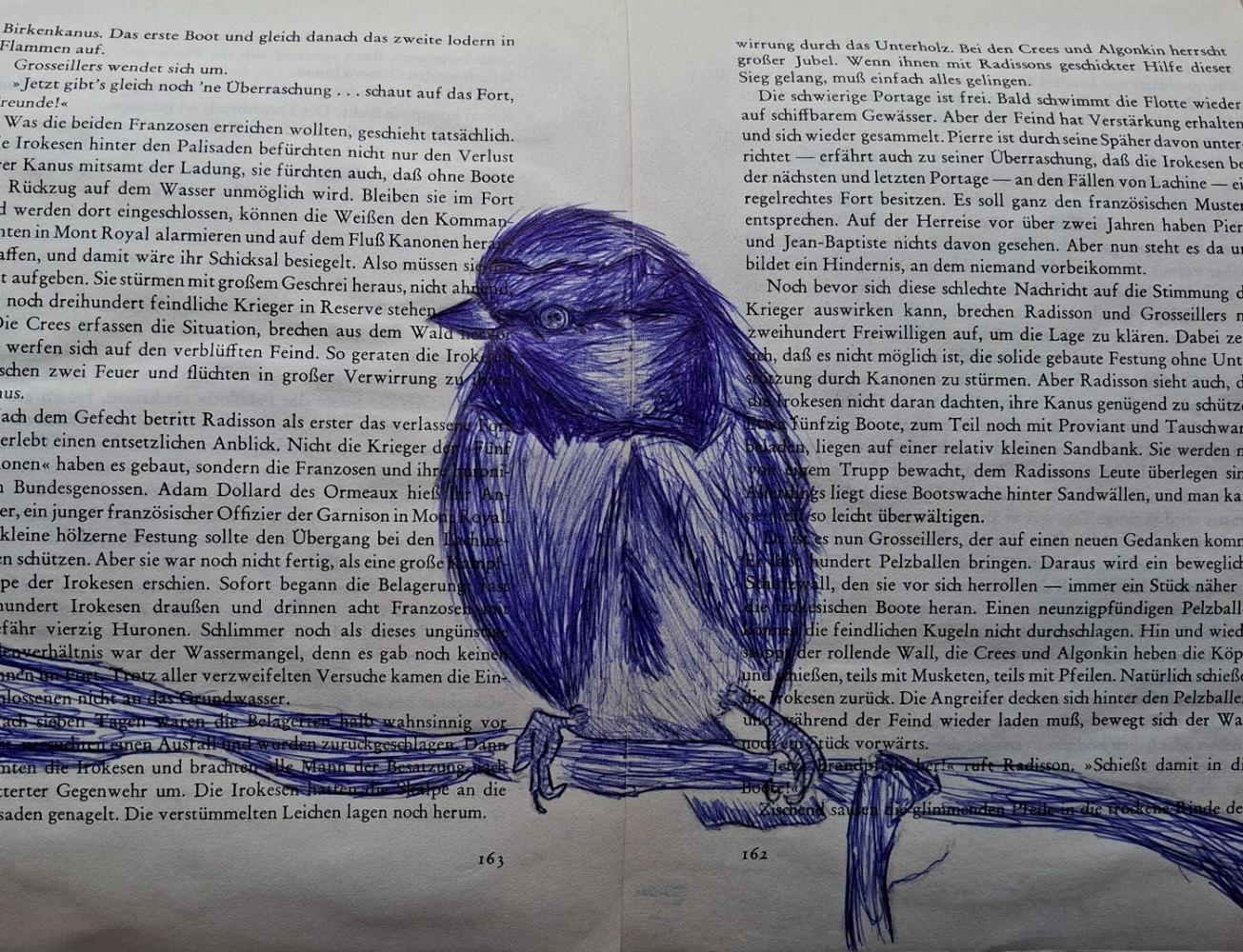 Heimische Vögel von Mittelschule Ilse-Brüll-Gasse 07. Januar 2026 4b Galerie Ihre Vögel zeichneten die Schüler*innen der 4b mit blauem Kugelschreiber. Als Hintergrund wurden Seiten aus einem alten Buch verwendet.