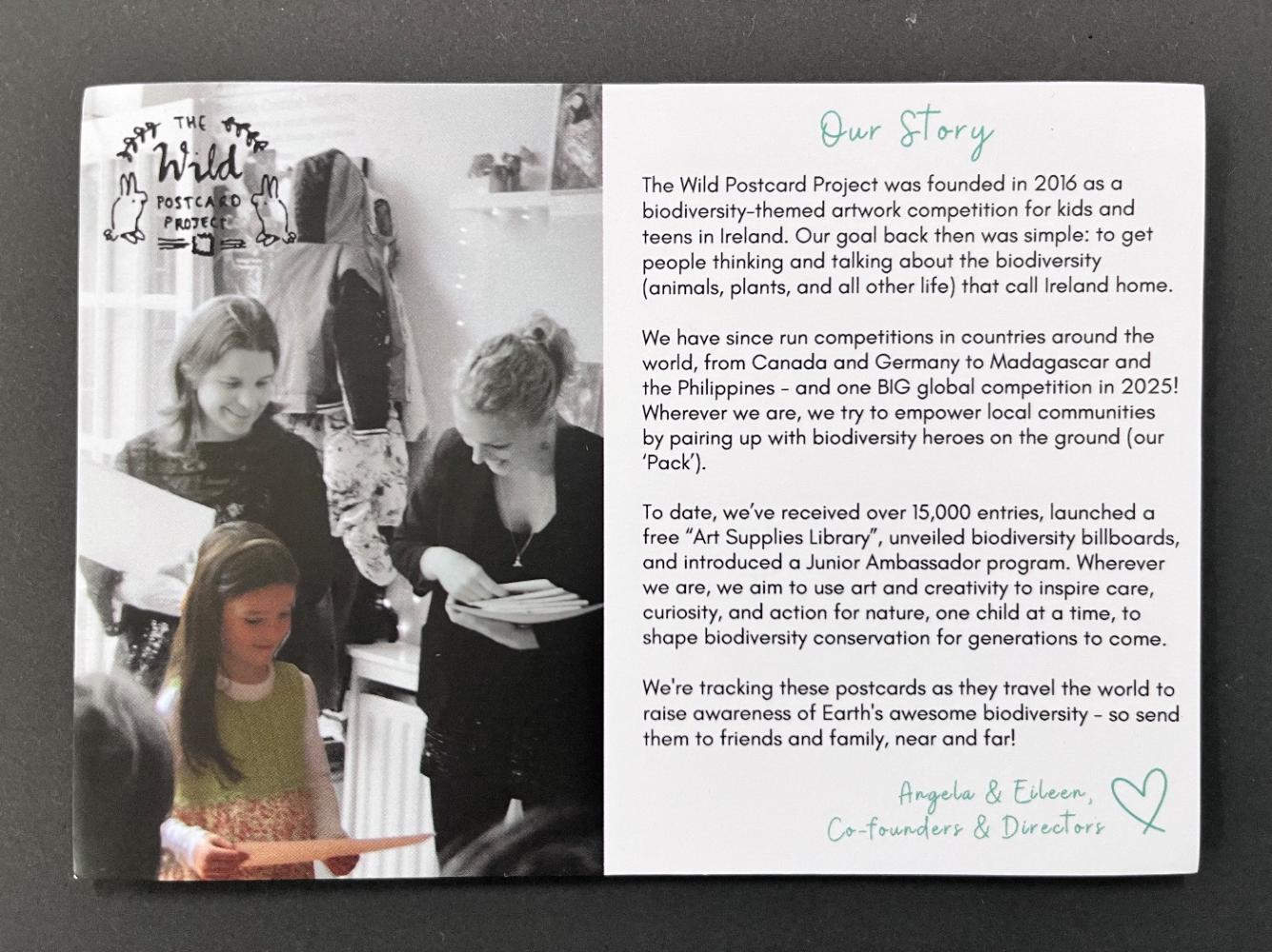 Das Wild Postcard Project ist ein internationales Kunstprojekt, das Kinder und Jugendliche weltweit dazu ermutigt, sich kreativ mit dem Thema Biodiversität und Naturschutz auseinanderzusetzen. Mit Zeichnungen und Collagen machen die jungen Künstlerinnen und Künstler auf Tiere, Pflanzen und Lebensräume aufmerksam.