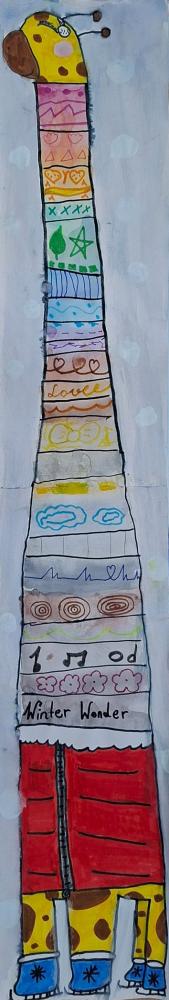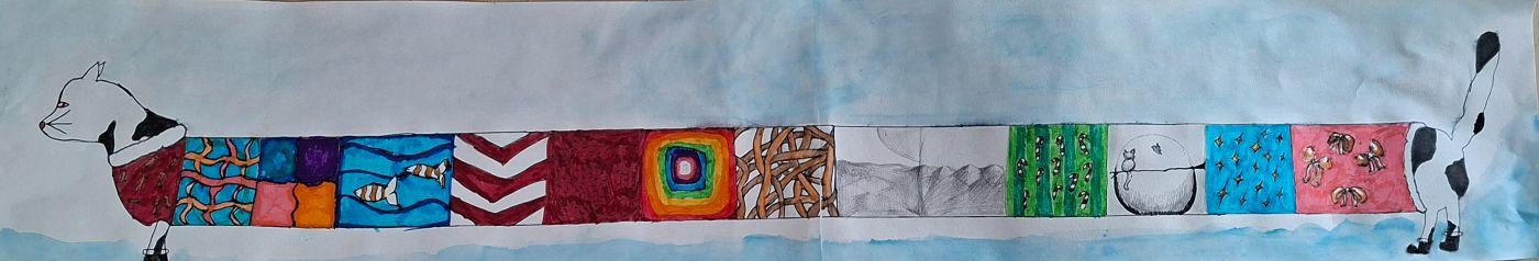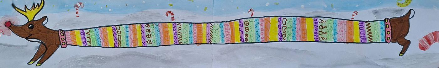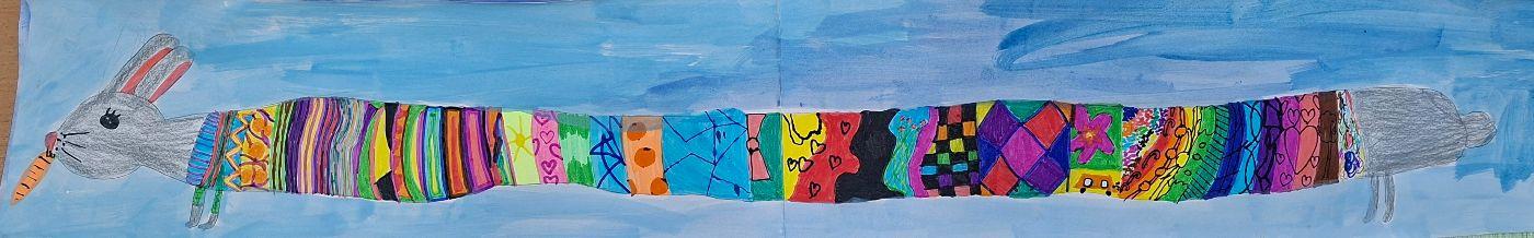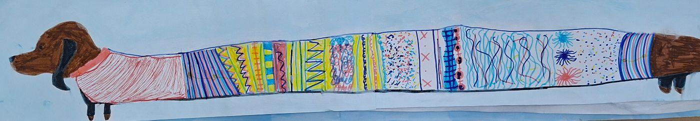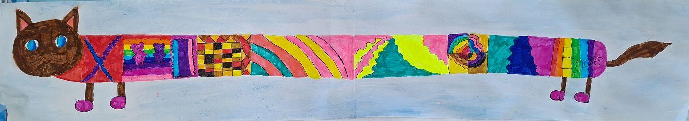 Tiere XXL von Mittelschule Ilse-Brüll-Gasse 07. Januar 2026 1a Galerie Die Schüler*innen der 1a zogen ihre Tiere in die Länge, damit besonders viel Platz für zum Malen eines bunten Pullovers blieb.