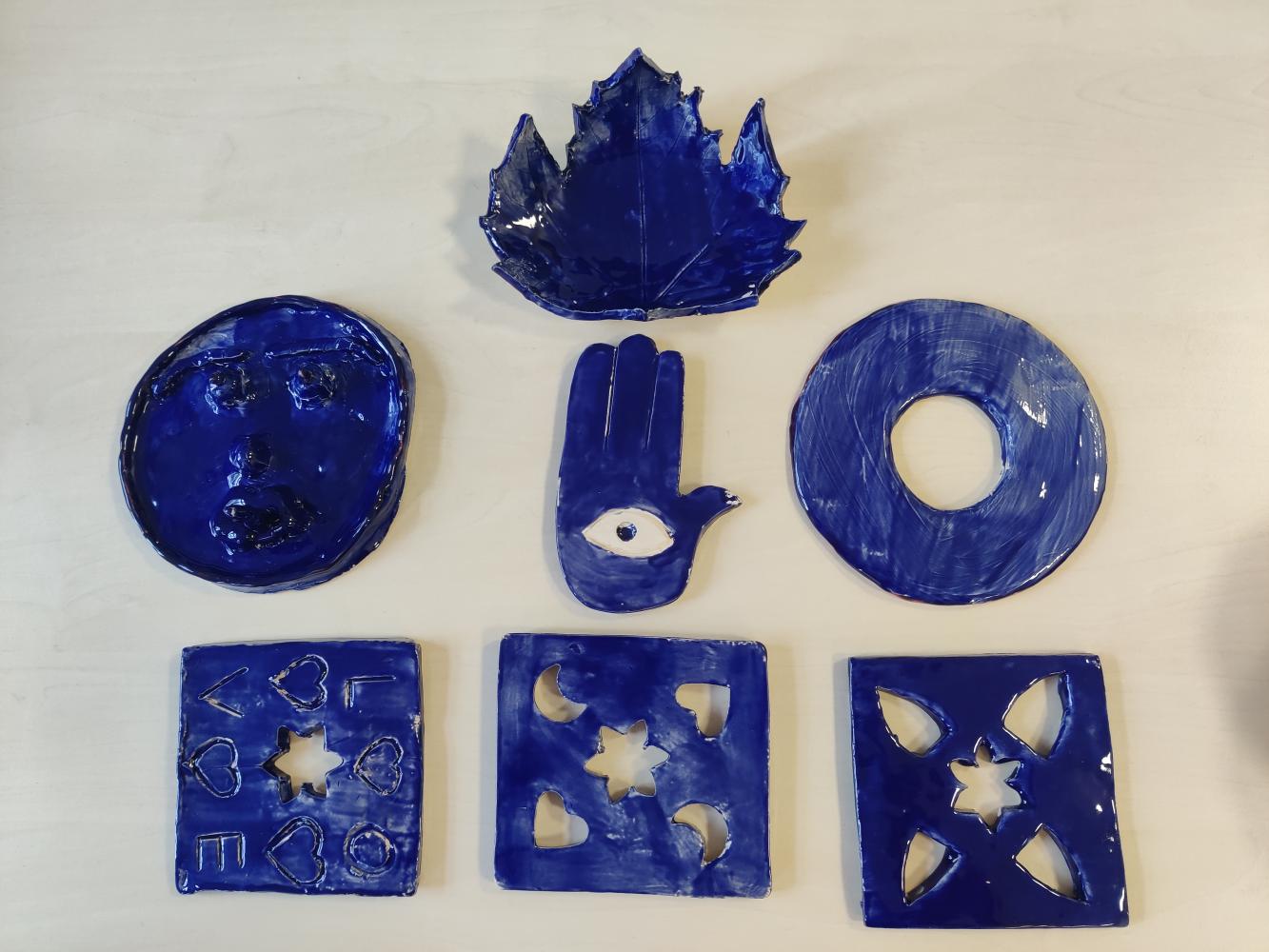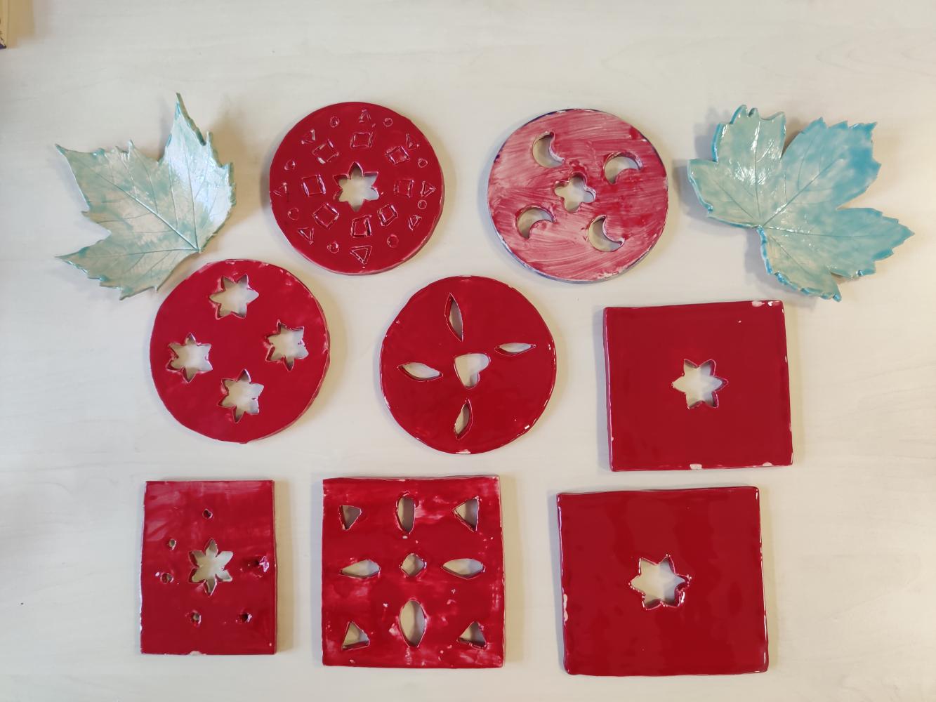Einen Klumpen Ton zu einer ebenmäßig starken und glatten Fläche auszurollen, war gar nicht so einfach. Mit Keksausstechern, Messern und Blättern wurde die Fläche gestaltet. Nach dem Vortrocknen kamen die Werkstücke in den Brennofen, wurden im zweiten Arbeitsgang mit einer Farbglasur überzogen und nach dem erneuten Trocknen wieder 11 Stunden bei ca. 1200° C gebrannt.