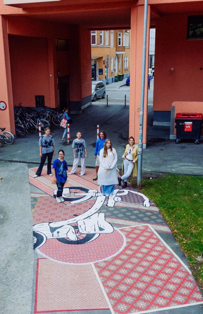 In der Folge wurden ihre Werke während der Unterrichtszeit beim benachbarten OpenSpace fertig gestellt, wo die Schülerinnen dann auch noch einen magic carpet anfertigen durften, über den man dort immer noch drübergehen kann. Vom Beginn im Sonnenschein im September bis in den kalten Oktober hinein, haben die Schülerinnen großes Interesse und Geschick, aber auch Durchhaltevermögen bewiesen.
